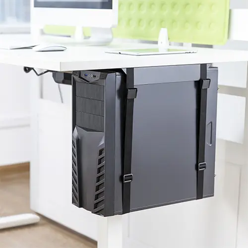 Крепление для системных блоков весом до 10 кг для подвеса под стол в вертикальном или горизонтальном положениях.