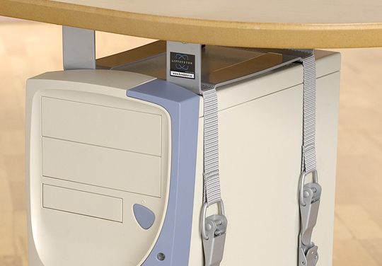 Лучшее решение, это прикрепить системный блок к столешнице, с помощью специального крепления.