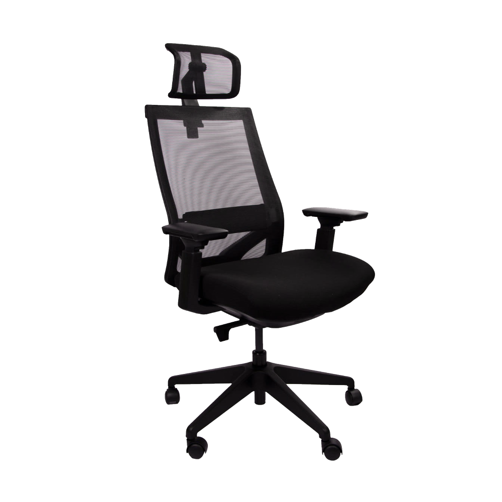 Эргономичное офисное кресло с 4D-подлокотниками, сетчатой спинкой с поддержкой поясницы, регулируемым подголовником и механизмом качания.