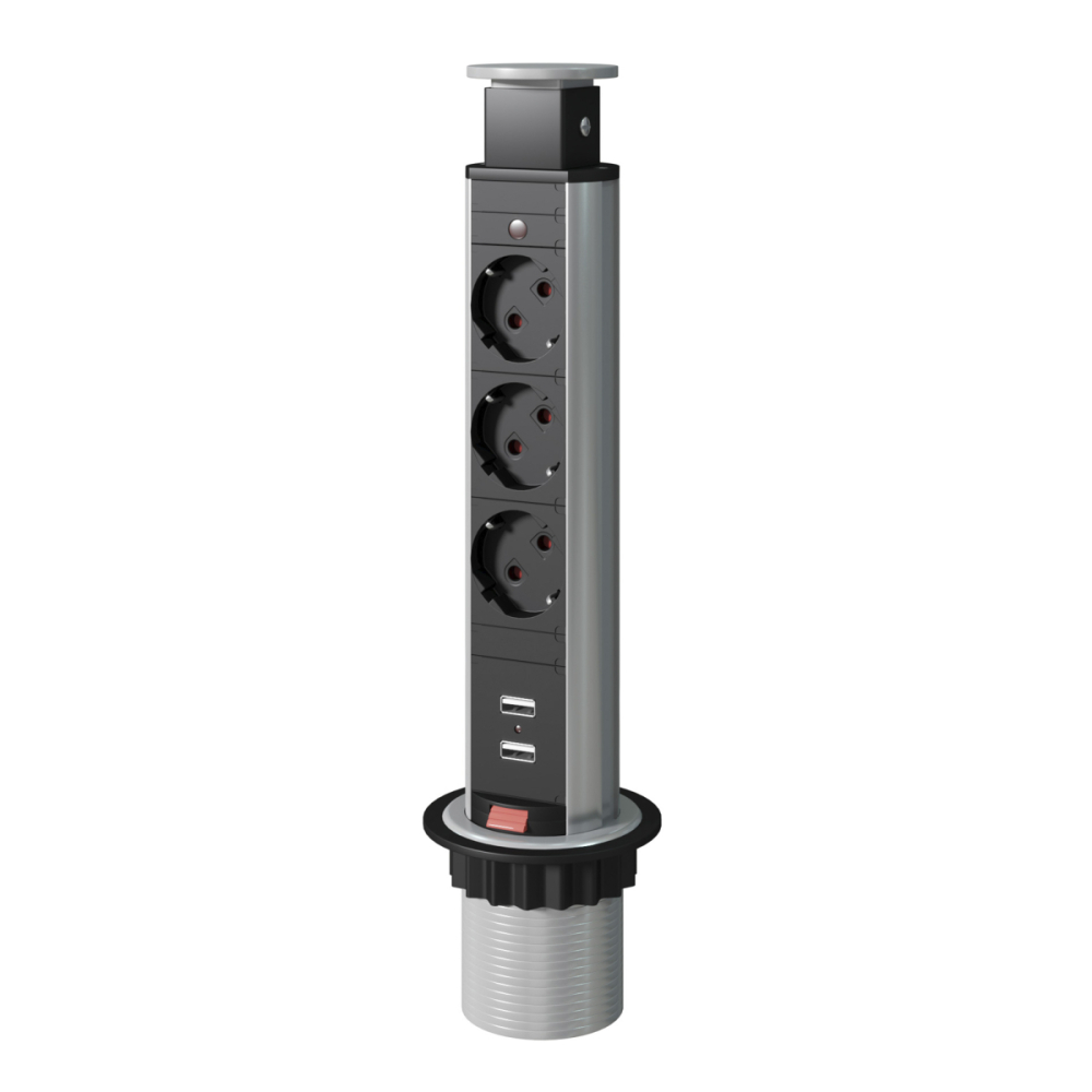 Розетка встраивается в столешницу, в исходной позиции она полностью спрятана под столешницей.